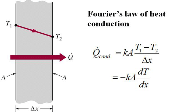 Figure 1. Fourier's law (Yunus, C. (2017) Heat and Mass Transfer) Legend: Q: Heat transfer rate (W/m2․k), K: Thermal conductivity (W/m․k), T1: High surface temperature (℃), T2: Low surface temperature (℃), Area (m2), ΔX: Thickness (m)