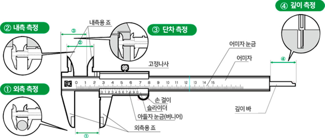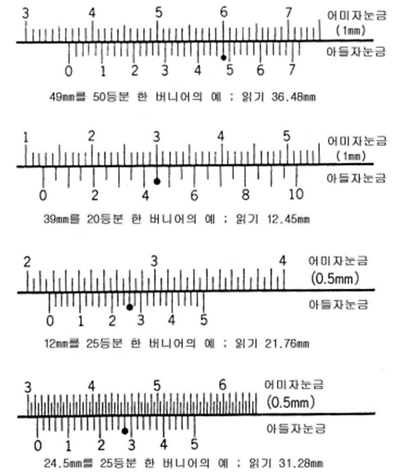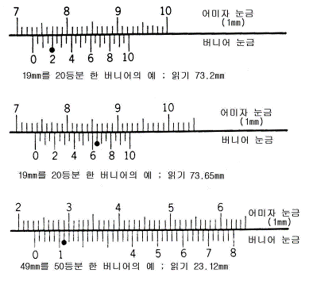 | M형 캘리퍼스 | 15cm, 20cm, 30cm | 1/20mm (0.05) | 1mm | 19mm를 20등분 한 것 |