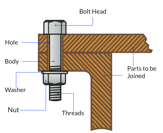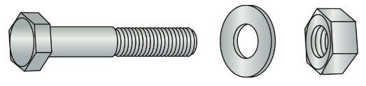 볼트는 한쪽 끝에 육각형(때로는 정사각형) 머리가 있고 다른 쪽 끝에 나사산(전체 또는 부분적으로)이 있는 원통형 물체입니다. 너트는 볼트의 짝으로, 내부에 나사산이 있는 육각형(때로는 정사각형) 물체입니다. 볼트와 너트의 나사산 피치가 같아야 올바르게 고정할 수 있습니다.