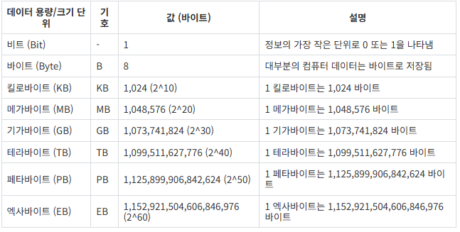| 데이터 용량/크기 단위 | 기호 | 값 (바이트) | 설명 |